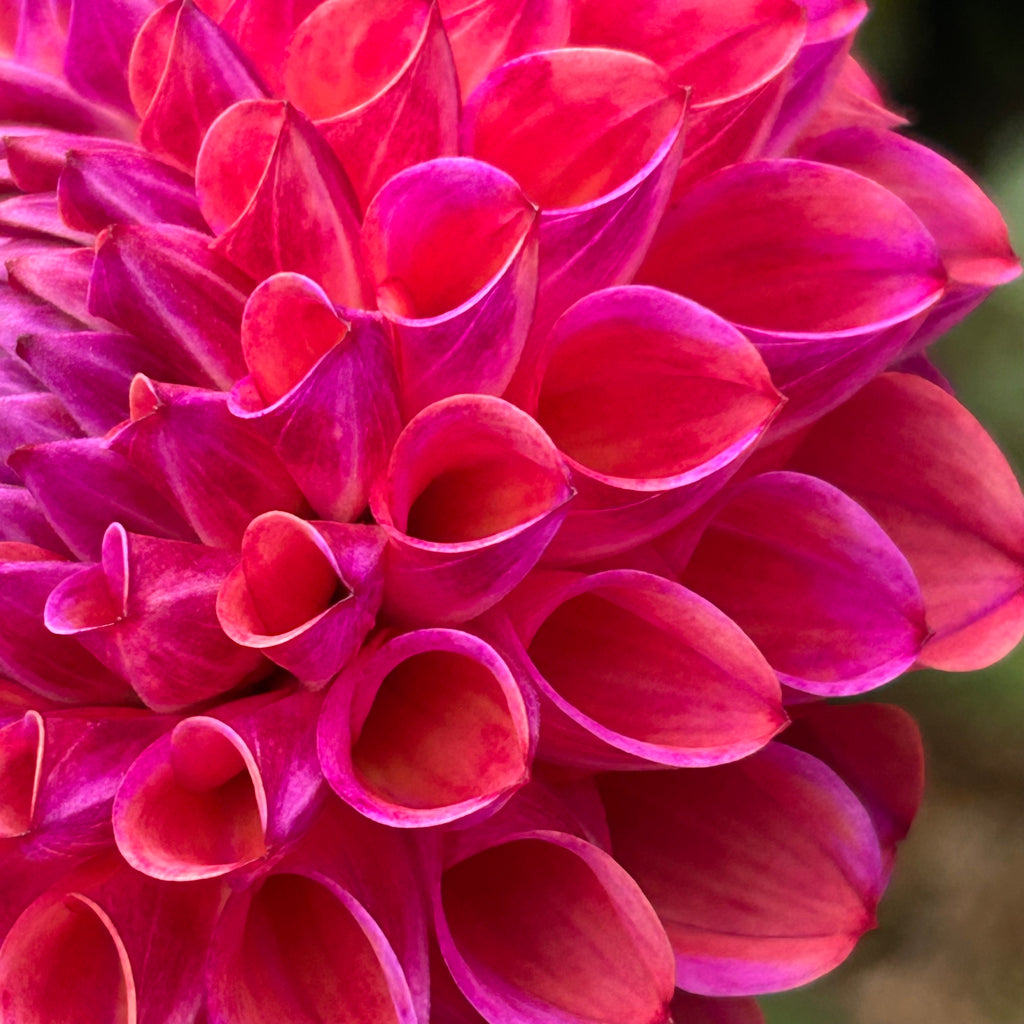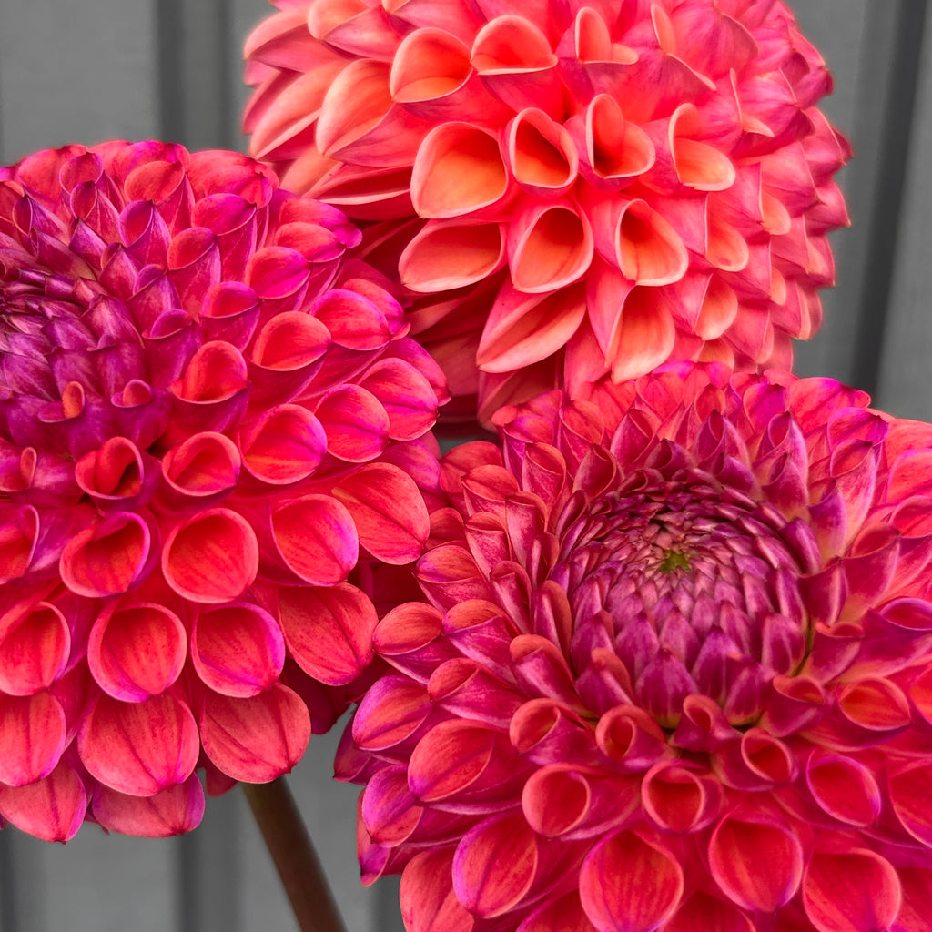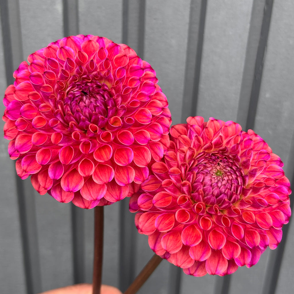 This is my favourite dahlia so far this season! I can't stop looking at the incredible electric purple and peach petals in their amazing perfect ball formation. WOW! Stunning in a bouquet - and even as a single flower in a stem vase.